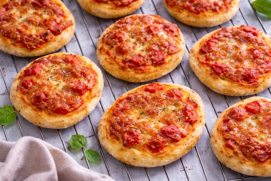 - Lag 9 små pizzaboller på første brett og 5 på neste brett.