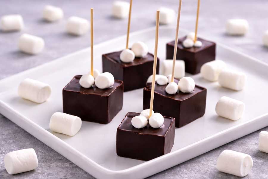 - Legg mini marshmallows i bunnen og hell over sjokoladen.
